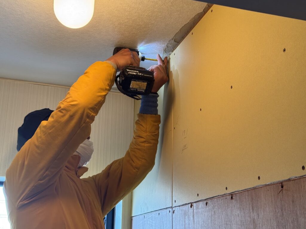 必ず胴縁を組み、下地のピッチを細かく整えてからボードを張ります。