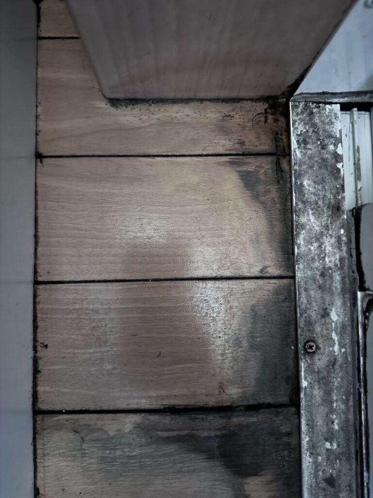 お風呂の引戸のレールに水が溜まっていて開け閉めの時に脱衣所へ溢れていたとのこと。