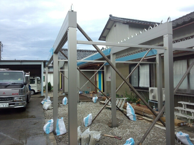 塗装親方・三上浩平ブログ棟梁カズの現場日記2012.09.18花壇があった所にカーポートを作ります柱が立つ根元に穴を開けてアルミの柱をたてていきます柱の長さを調整して切断していきます柱、梁と順序よく組立ていきます今日はここまでです。この後、柱の根元をコンクリートで固めて屋根を乗せて完成です無料お見積りはこちら