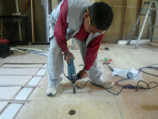 キッチンが設置する場所に床に穴をあけてからの給水の配管を立ち上げます