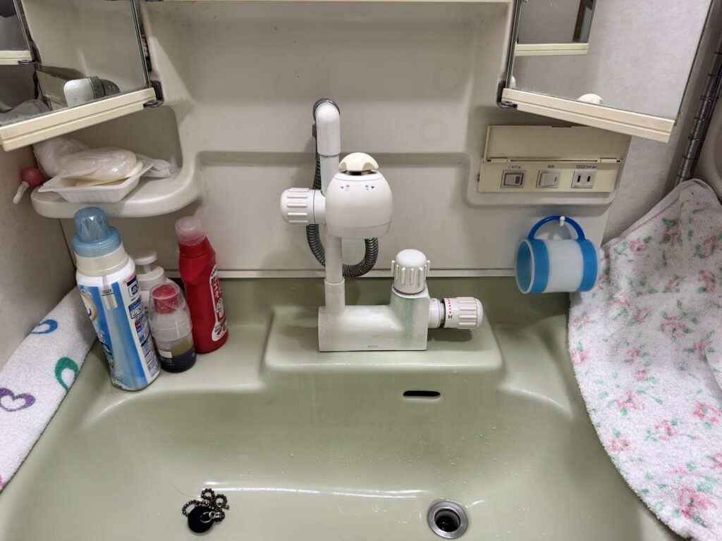 確認すると、洗面台の蛇口本体、特にハンドル部分からポタポタと水が垂れている状態でした。