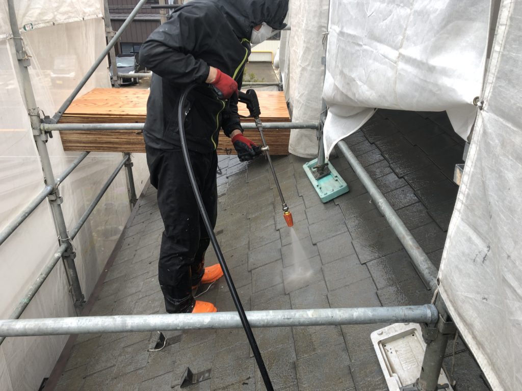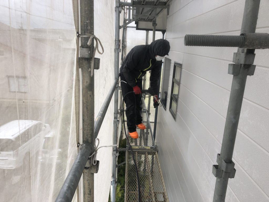 塗装親方・三上浩平ブログ高圧洗浄機を使って外壁の水洗い表面に付いた汚れや塗膜の劣化で起こるチョーキング(さわると手に白い粉が付く現象)の粉などを綺麗に洗い流していきます。水洗いを綺麗にしておかないと塗装をしたときに外壁と塗料の密着が悪くなって捲れの原因になります。流れてきた水は白く濁っています。外壁表面がチョーキングをおこしていたためです。汚れも落ちて綺麗になりました。