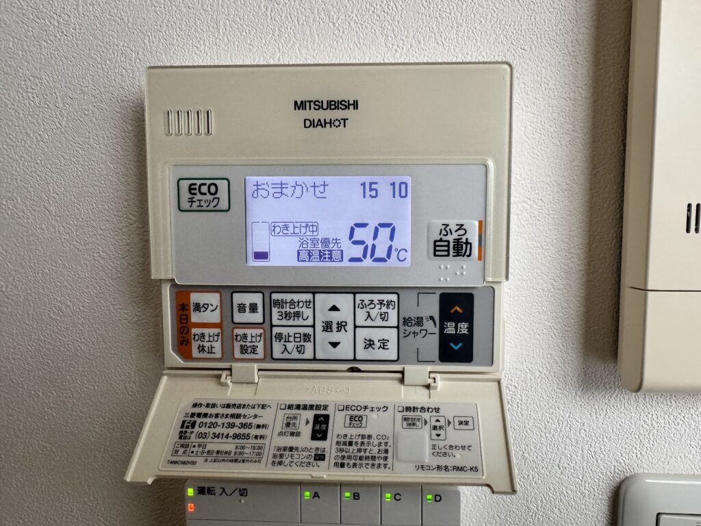 室内に入り、リモコンを見ると「沸きあげ中」の表示。