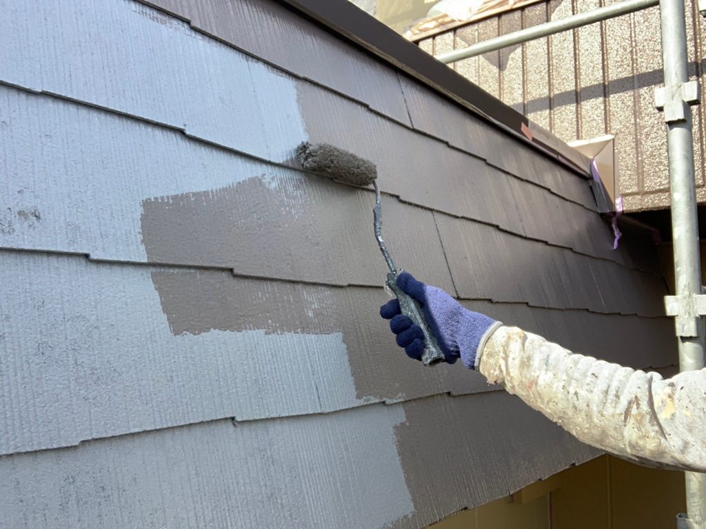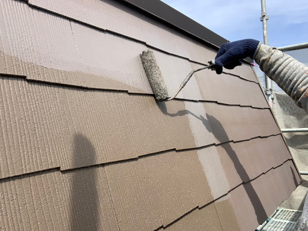 コロニアル屋根の中塗りを行います。
