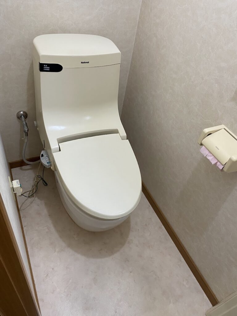 既存は古いナショナル製の一体型トイレ。