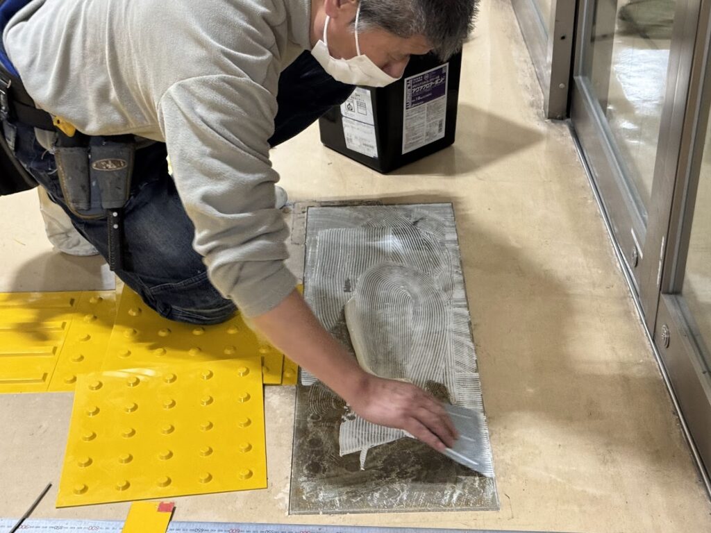 ボンドを塗布して新しい点字ブロックを貼っていきます。