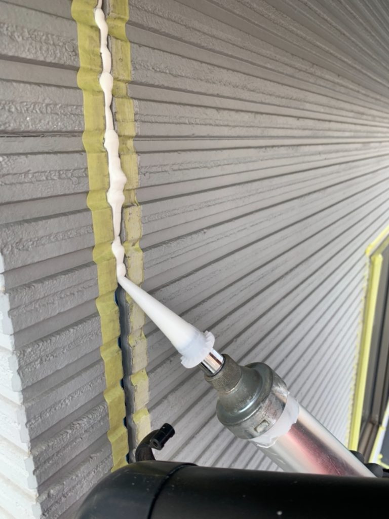 既存のコーキングを撤去していきます。そして、撤去した目地の周りにマスキングテープを貼り専用のプライマーを塗っていきます。シーリング材を専用のガンに入れて