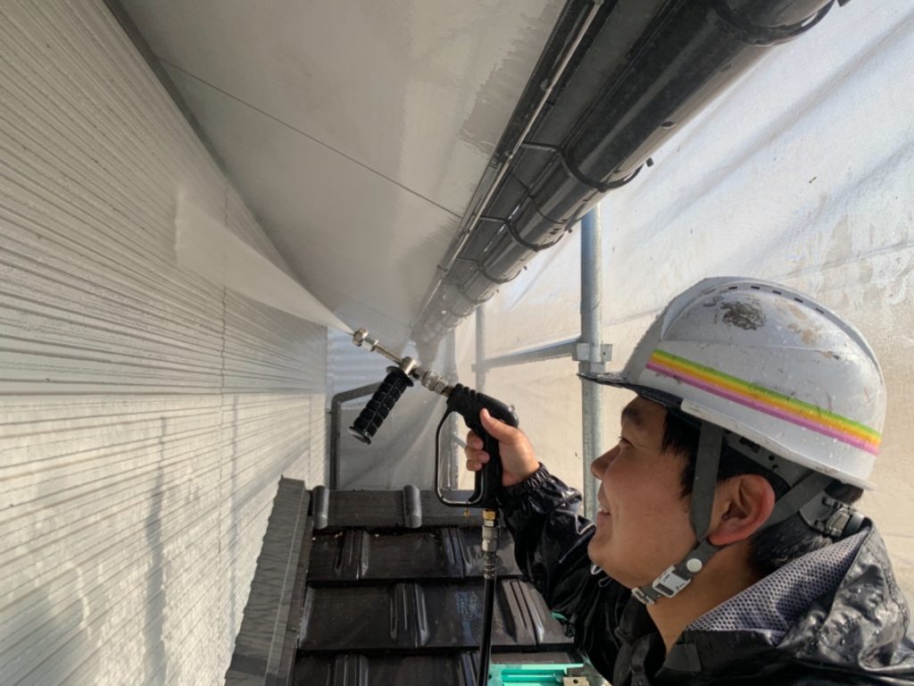 水洗いを綺麗にしておかないと塗装をしたときに外壁と塗料の密着が悪くなって捲れの原因になるのでしっかり行っていきます。