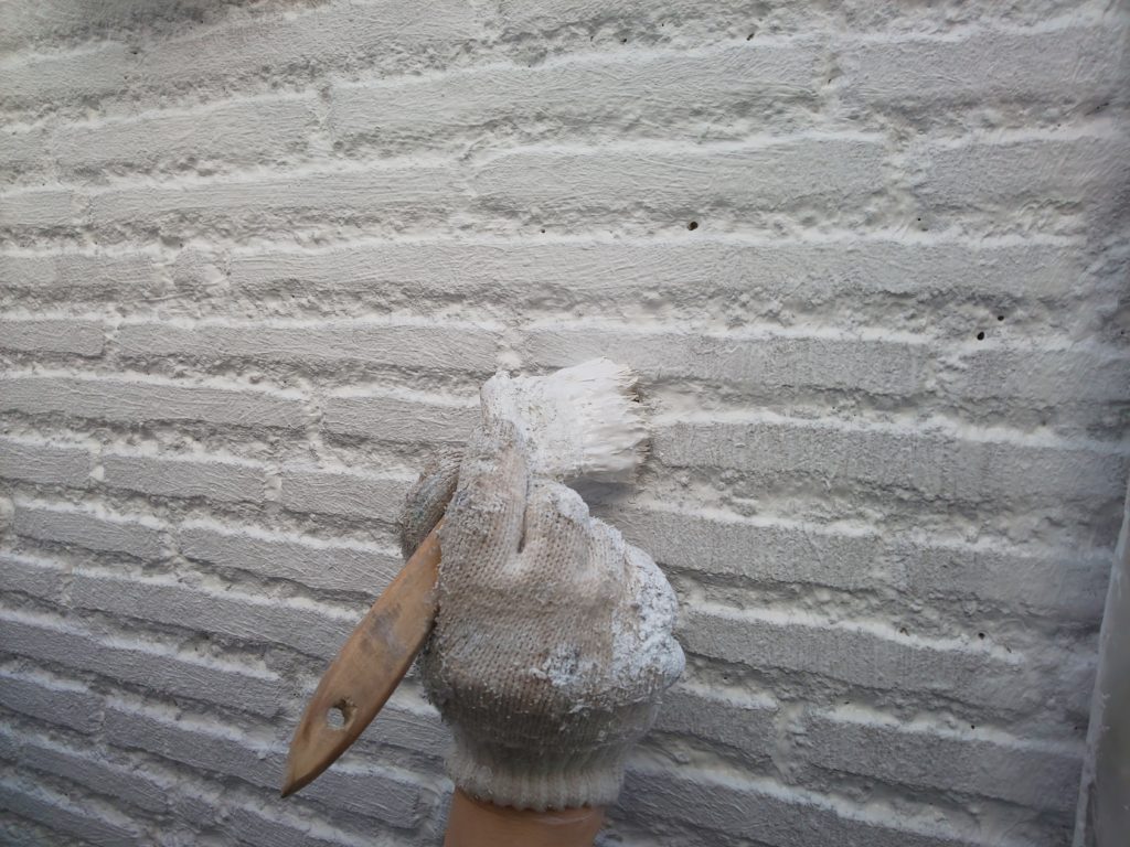 既存の外壁が欠けている箇所をモルタル(コンクリート)で埋めていく作業になります。塗料を塗る前にこの作業をしておくと、雨水が侵入するのも多少防ぎ、塗装面の見栄えも良くなると思い施工させて頂きました。